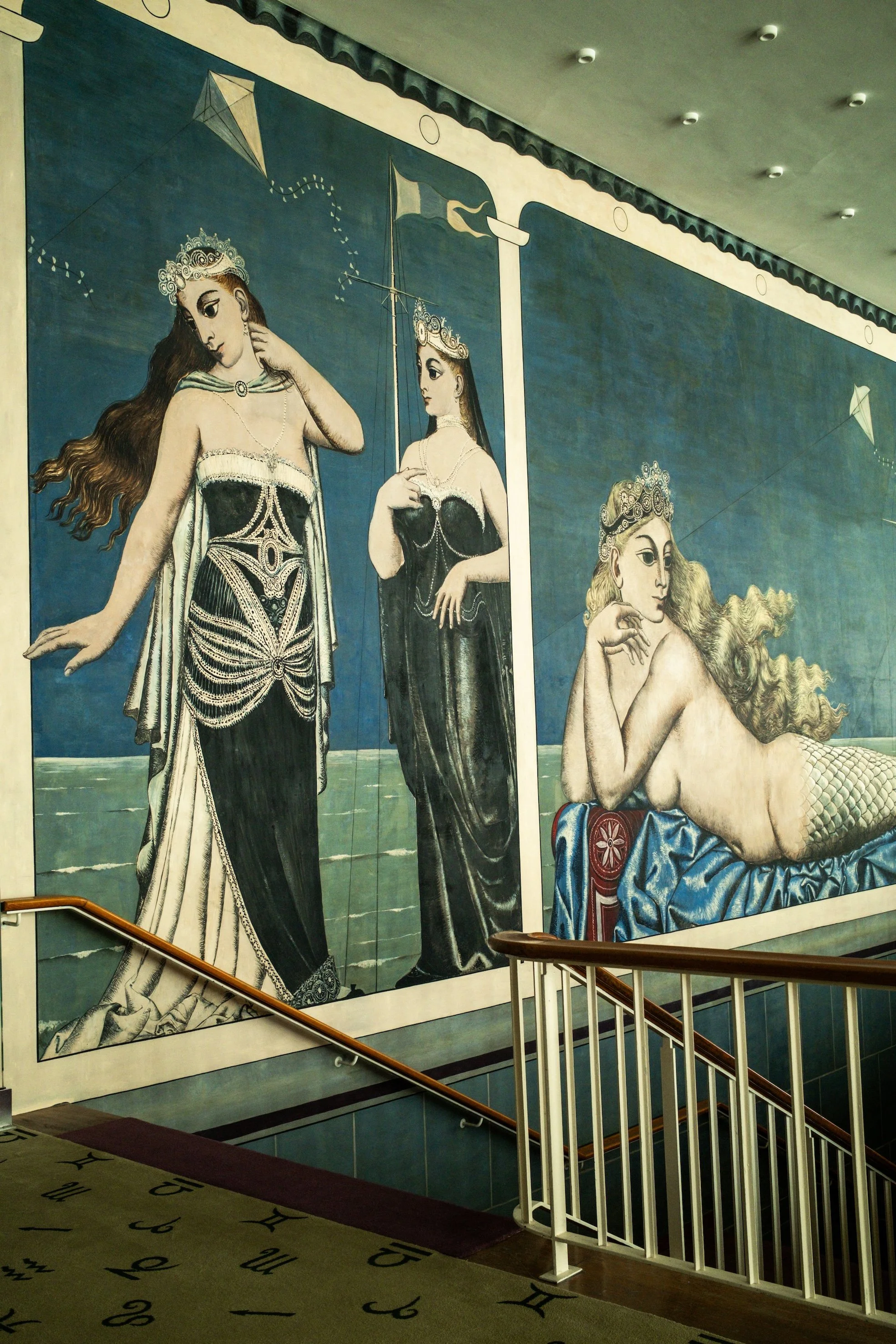 Aujourd'hui, le Kursaal n’est pas seulement un casino ; c’est aussi un centre culturel dynamique. Ce qui frappe lorsqu’on déambule dans les vastes couloirs, c’est la sensation d’entrer dans un musée à ciel fermé, un écrin discret pour l’art belge du XXe siècle. Ici, le divertissement n’exclut pas la culture, bien au contraire : elle s’y inscrit dans les murs. Parmi les œuvres les plus saisissantes, on trouve une peinture murale signée Paul Delvaux, grand maître du surréalisme belge. Dans son style inimitable, Delvaux y déploie un monde onirique peuplé de figures féminines et énigmatiques. La fresque, subtile et silencieuse, semble suspendre le temps, comme si Ostende elle-même hésitait entre rêve et réalité.
