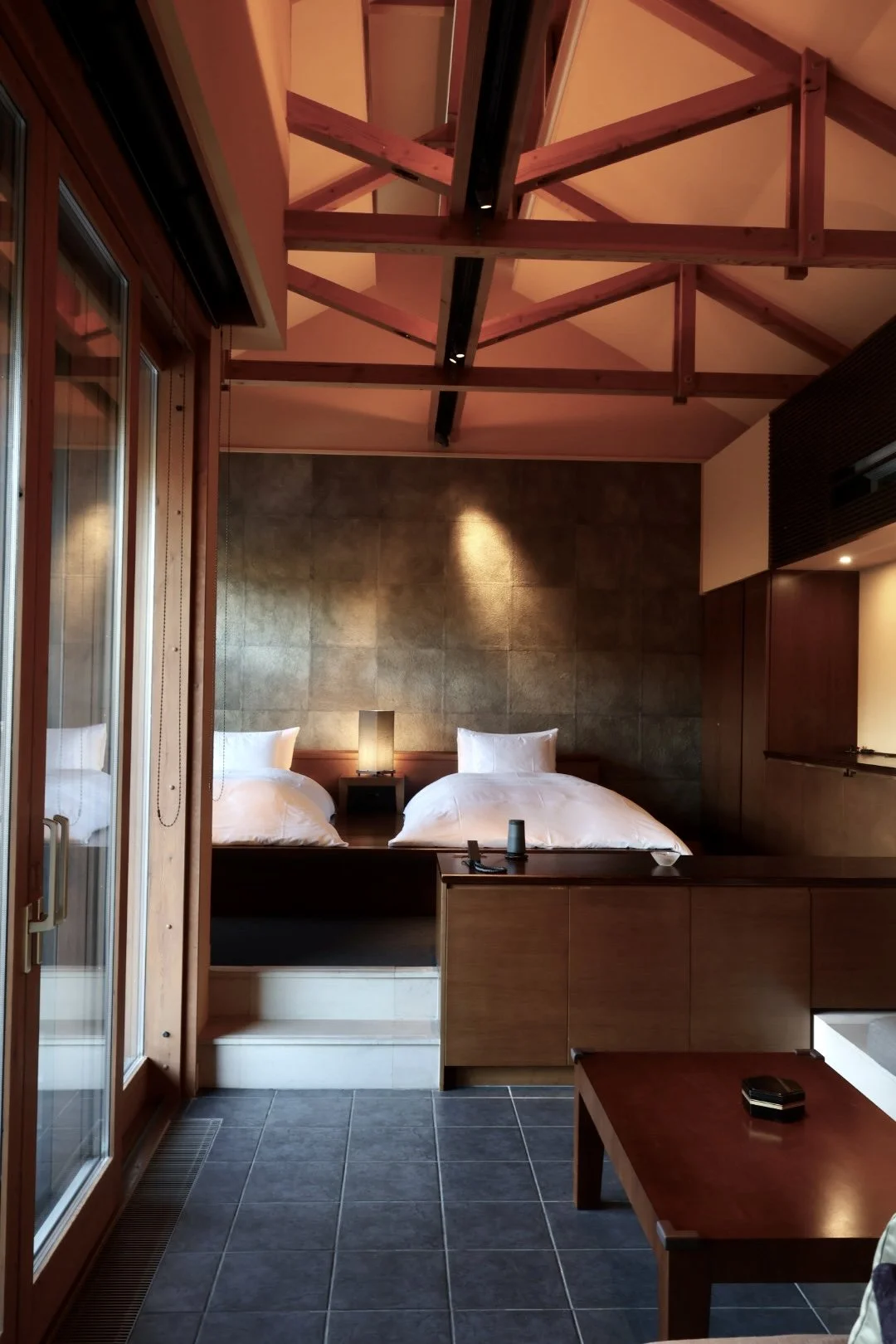 L'entrée dans l'hôtel nous enchante par la préservation de son environnement naturel. Le paysagiste Hiroki Hasegawa a préservé la forme de la vallée, de nombreux arbres centenaires et sa rivière naturelle. L'hôtel compte 22 maisons individuelles qui s'emboitent à la perfection. À la fois proche les unes des autres, elles gardent toutes leur intimité à l'intérieur.