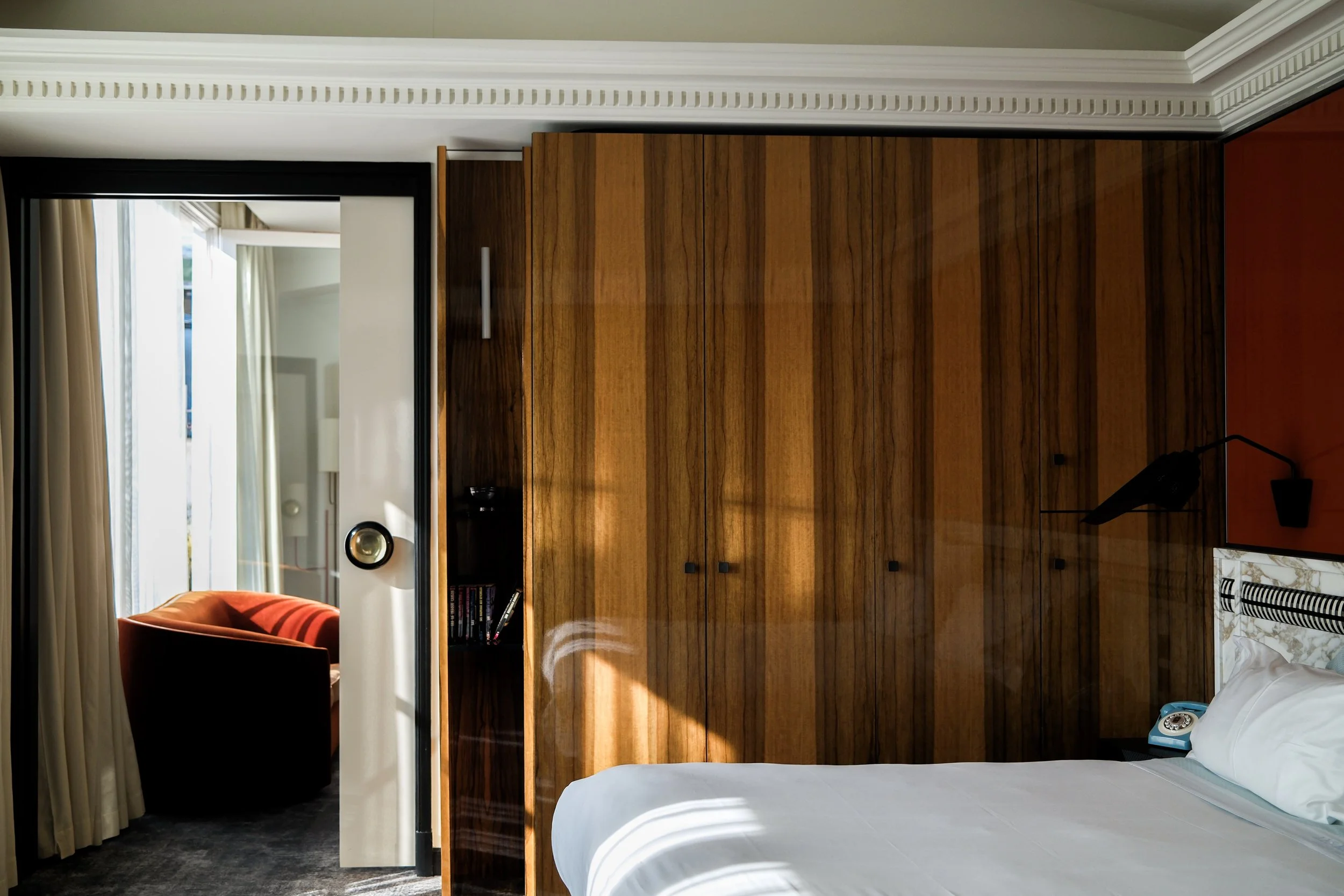 Aujourd’hui, l’hôtel propose 39 chambres et suites, dont un appartement de 80 m² avec terrasse que nous avons shooté pour notre numéro d'hiver 2025. La décoration intérieure allie bois précieux, marbre blanc et moquettes moelleuses, avec des références subtiles à l’histoire du lieu. Le restaurant, baptisé Roxo, offre une cuisine fusion contemporaine, tandis que le bar propose des cocktails originaux et des jus sains. Le « Club », situé au sous-sol, conserve son ambiance légendaire avec son carrelage noir et blanc et sa brume d’ambiance, rappelant l’atmosphère des années fastes.