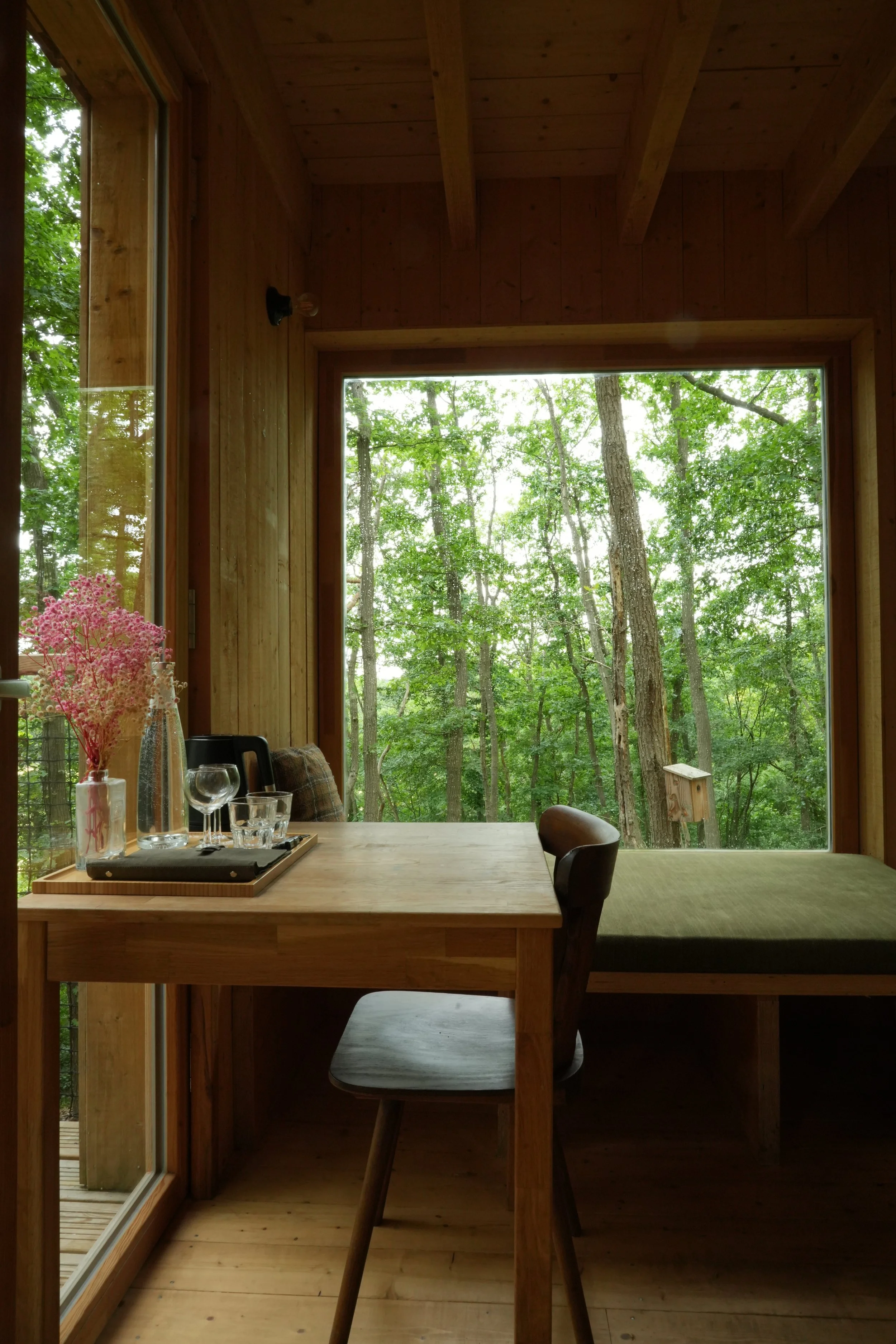 Les 18 cabanes imaginées par Rodaa Studio adoptent les formes de véritables observatoires : grandes baies vitrées encadrant la cime des chênes et des pins, plans sobres qui disparaissent dans le paysage. Conçues pour se fondre, elles ne dominent jamais la forêt, au contraire : elles s’y intègrent. Certaines sont perchées à 4 m, équipées d’un bain nordique pour ceux qui désirent une escapade en couple: celles en plain pied sont idéales pour un moment familial.